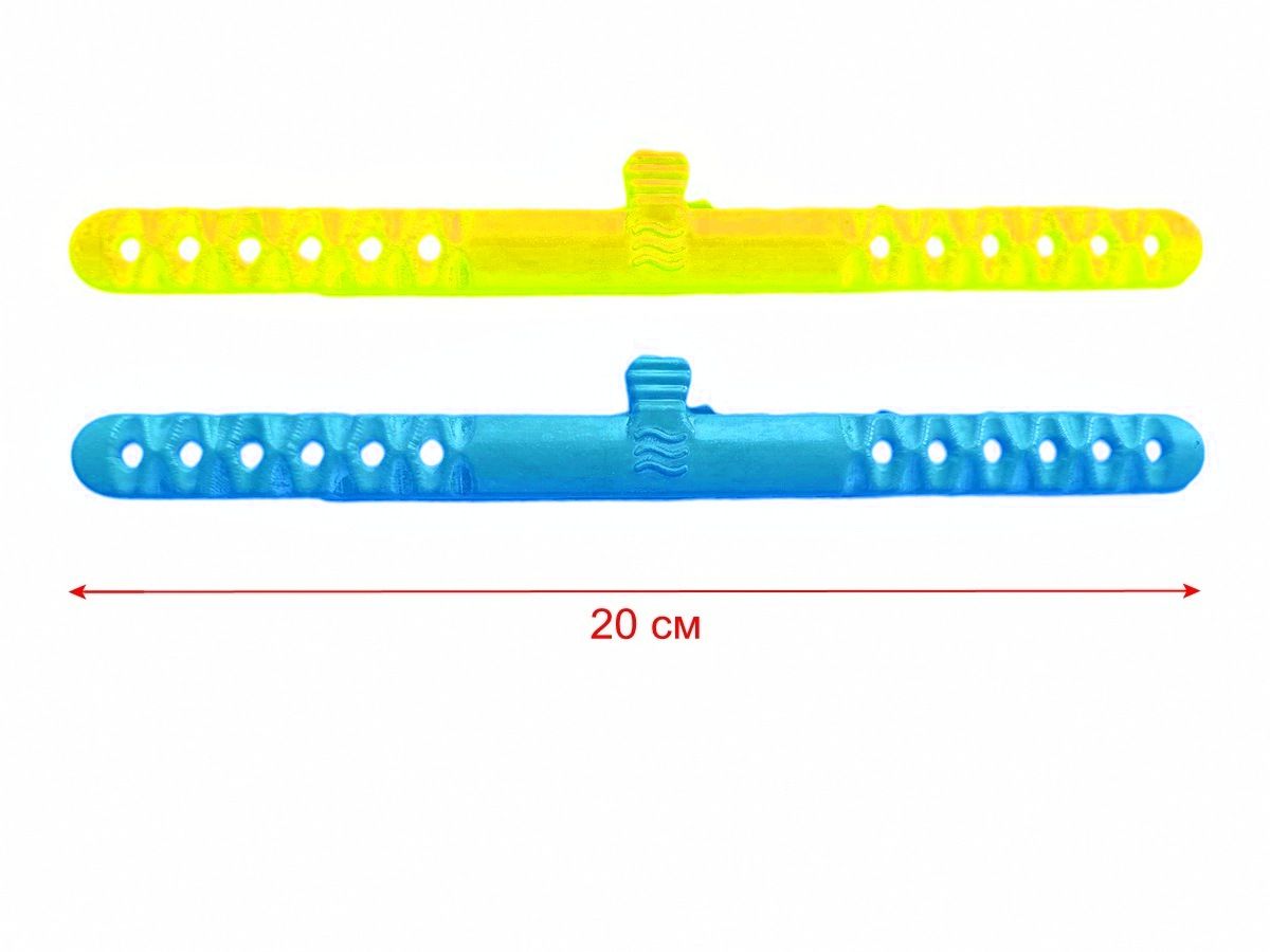 Фіксація стопи здійснюється зручною гумкою довжиною 20 см, з 12 отворами для фіксації (по 6 отворів на кожному кінці гумки). У комплекті ласта на ліву та ласта на праву ноги, позначені L та R.