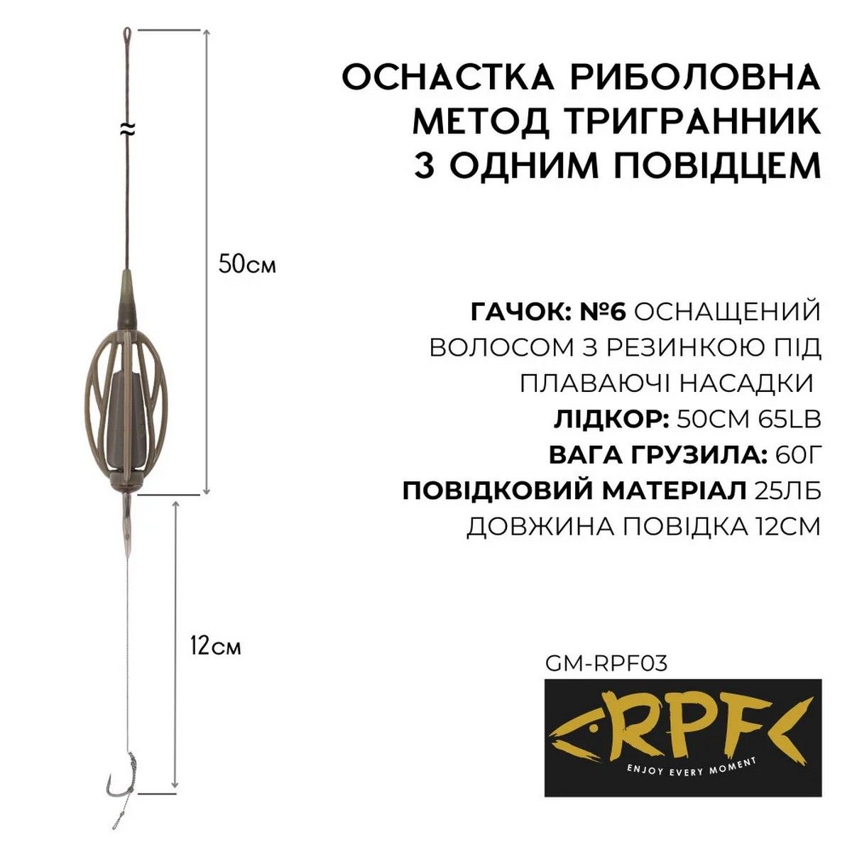 Оснащений Монтаж RPF Метод-Тригранник - готове рибальське оснащення з одним повідцем і одним гачком оснащеним волосом з гумкою для плаваючих насадок або донних насадок.