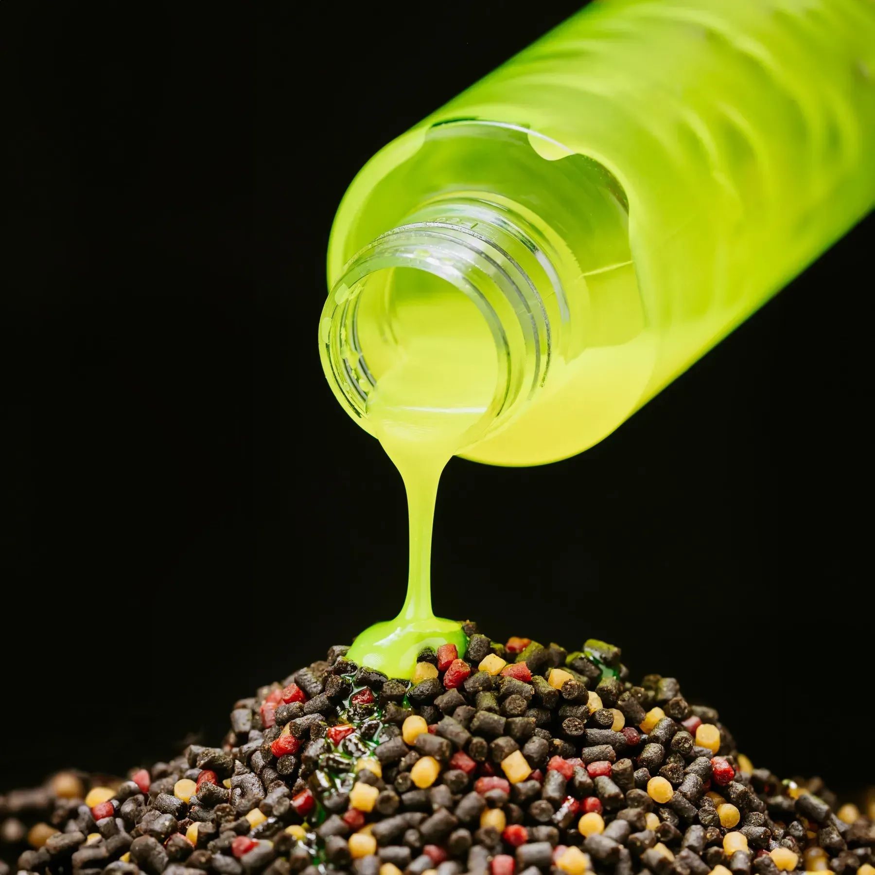 Добавьте воду температурой 30–40°C в баночку с ликвидом до полного объема, тщательно перемешайте. Полученную жидкость вылейте в пеллетс, хорошо перемешайте и оставьте на 40–60 минут до полного впитывания. После этого смесь готова к использованию в методной кормушке.