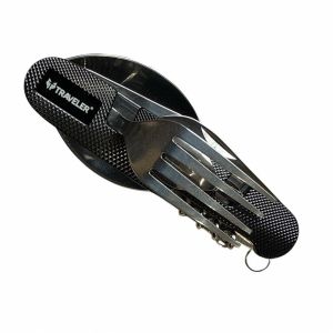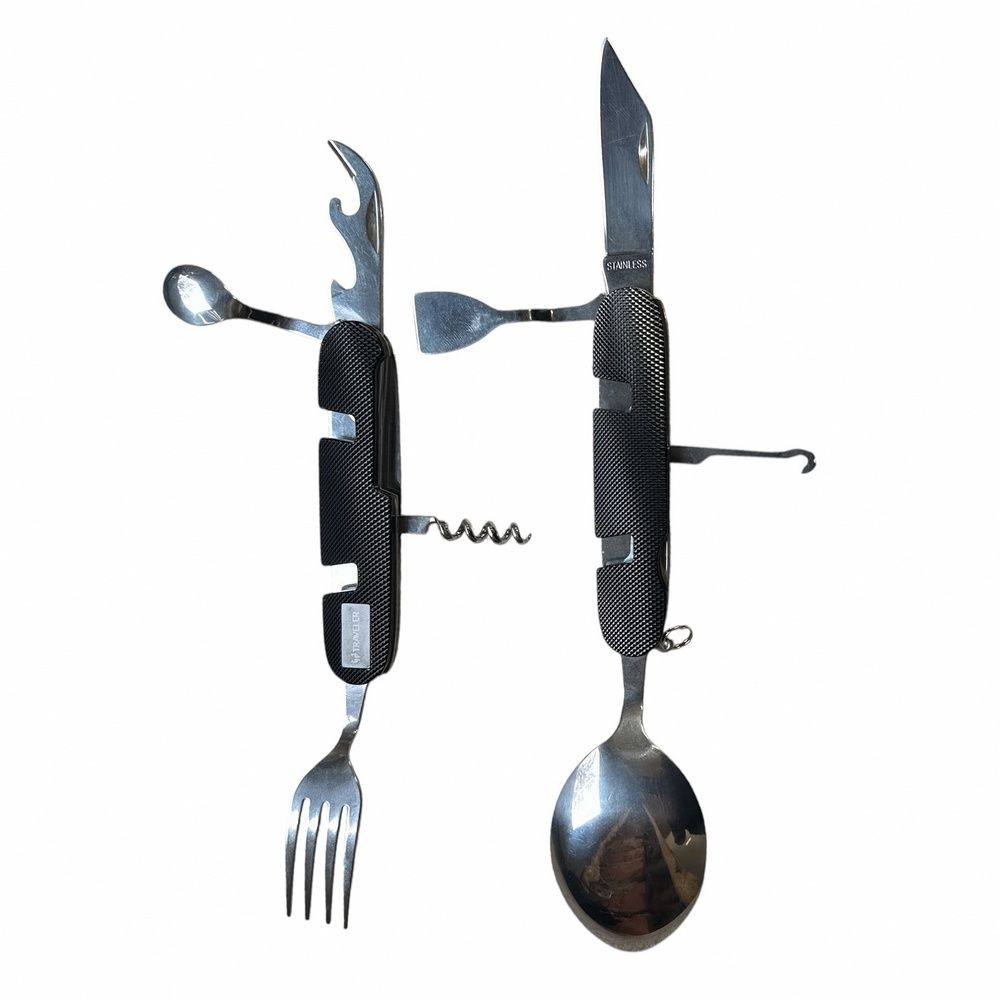 Содержит 9 инструментов: нож, вилку, ложку, чайную ложку, штопор, шило, крючок, открывалку-консервный нож, лопатку для жарки. Приборы в мультитуле складные. Размер в сложенном виде – 108 мм.
