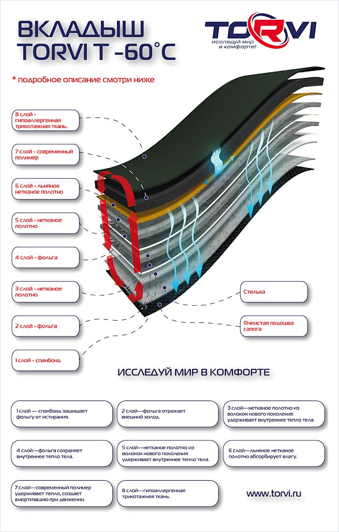 Отдельного внимания заслуживает утепленный сменный вкладыш сапог из ЭВА TORVI -60 °С, который надежно сохраняет тепло человеческого тела.