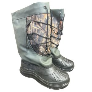 Верх чобіт виготовлений зі щільного зносостійкого ПВХ матеріалу з камуфляжною вставкою, що підвищує практичність та маскування на природі. Манжета оснащена шнурівкою з фіксаторами, що дозволяє щільно затягнути халяву та захистити ногу від попадання снігу, води та холодного повітря.