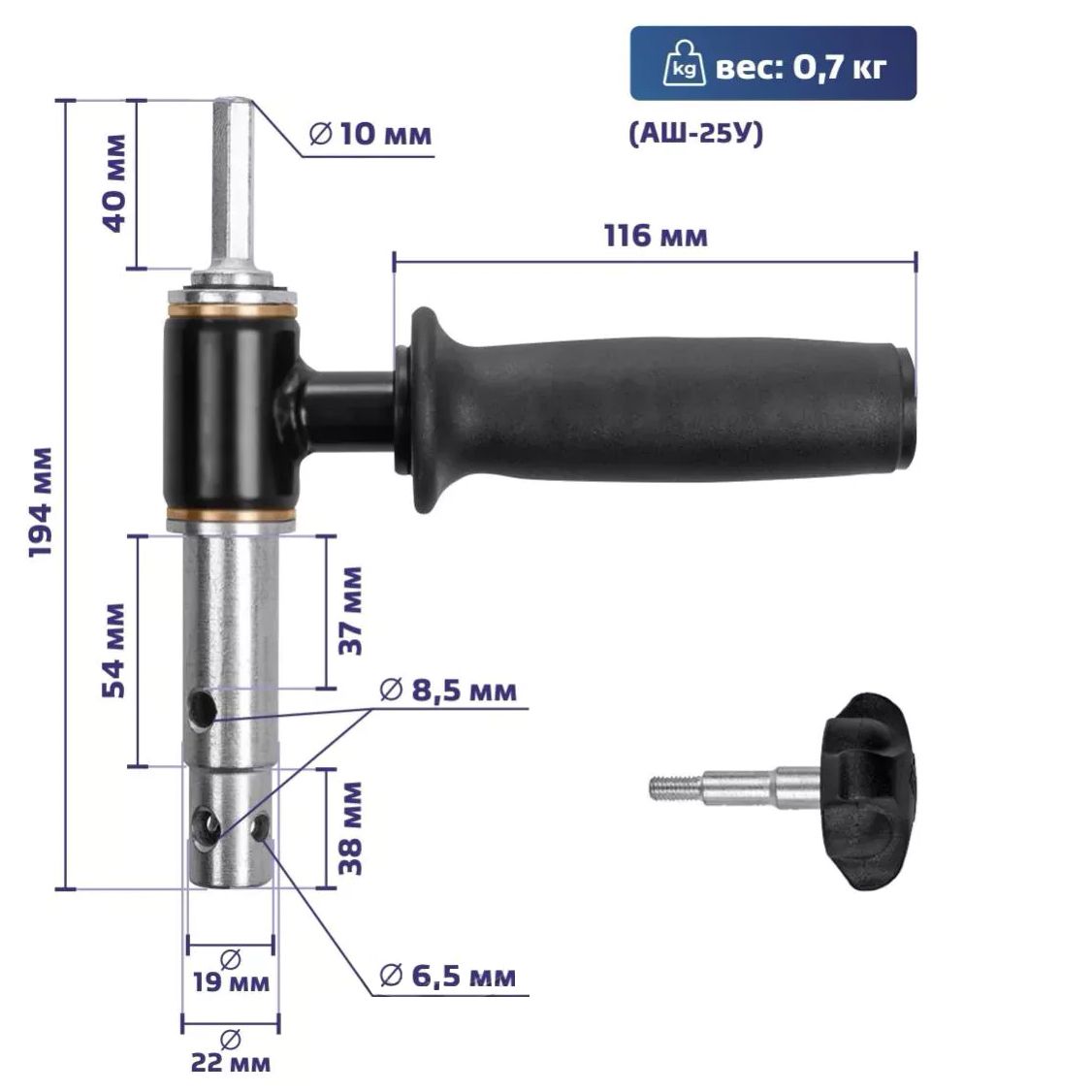- гвинт-баранчик з різьбленням М6 (отвір 6,5 мм) для приєднання до льодобурів ТОРНАДО-М2, BURAN та до подовжувача УА-400 для льодобурів ТОНАР та Helios;