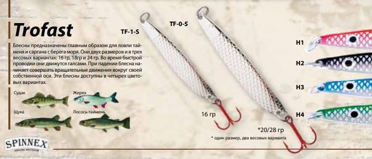 Блешні із серії Spinnex Trofast рекомендовані для лову щуки, судака та жереха на річках. Відмінно працюють під час проведення вгору за течією. Також можуть використовуватися для важкого морського спінінга. Завдяки особливій конструкції, під час рівномірного проведення блешня ходить галсами, а на опаді починає робити коливання.