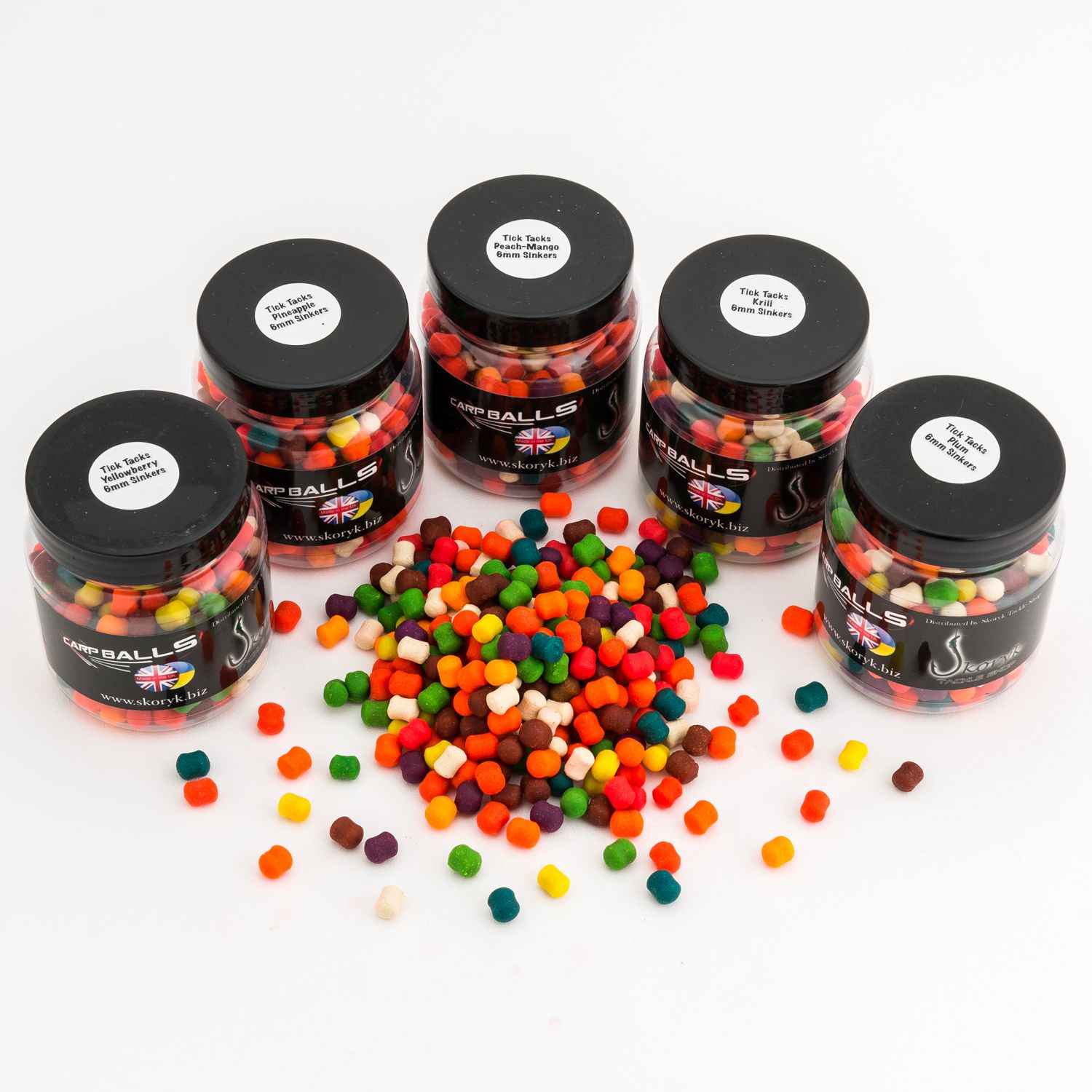 Сarp Balls Tick Tacks Sinkers це яскраві, різнокольорові тонучі бойли, які були розроблені в Англії відомим шеф-кухарем Скоттом Реткліфом по спеціальному замовленню спортсмена-короп'ятника Валерія Скорика. Вони виготовляються за унікальною рецептурою, тільки з натуральних інгредієнтів і виключно вручну.