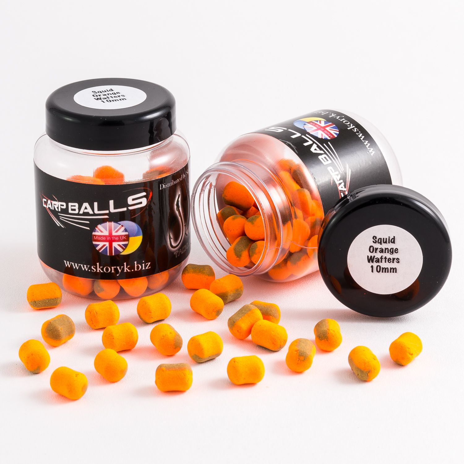 Wafters Squid Orange мають яскравий колір, що робить їх більш помітними в будь-яких умовах лову. У свою чергу додатковою принадою служить і чудовий аромат кальмара з апельсином, який відмінно працює в будь-яку пору року. Оскільки цей аромат розчинний у воді, він вільно розповсюджуватиметься навколо Вашої приманки і залучатиме коропа здалеку.