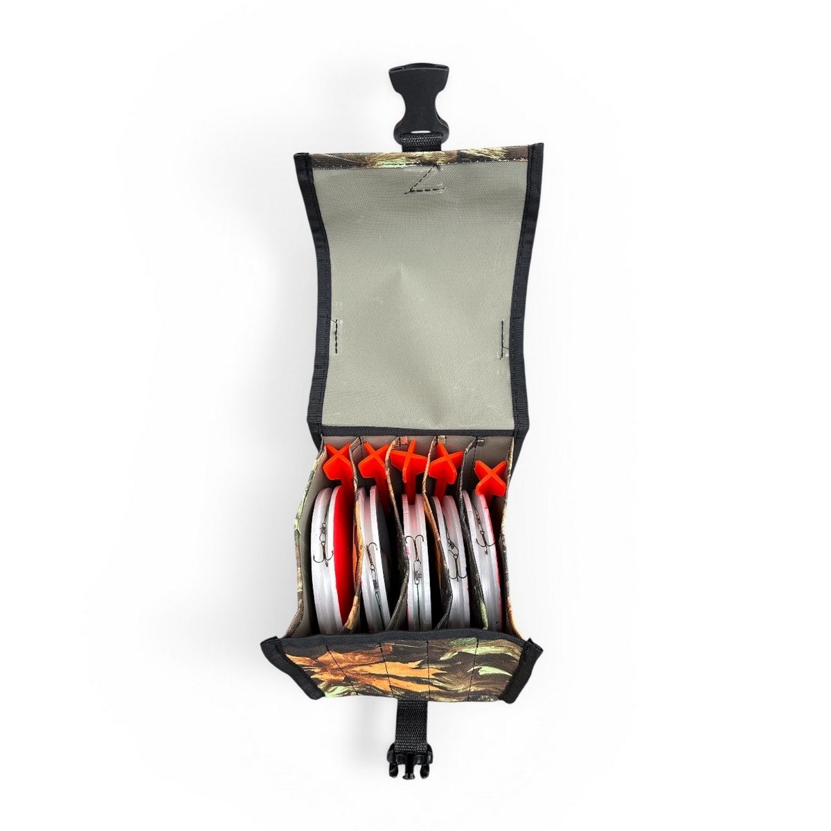 - Сумка має 1 великий відділ розділений на 5 вертикальних секцій для рибальських гуртків.