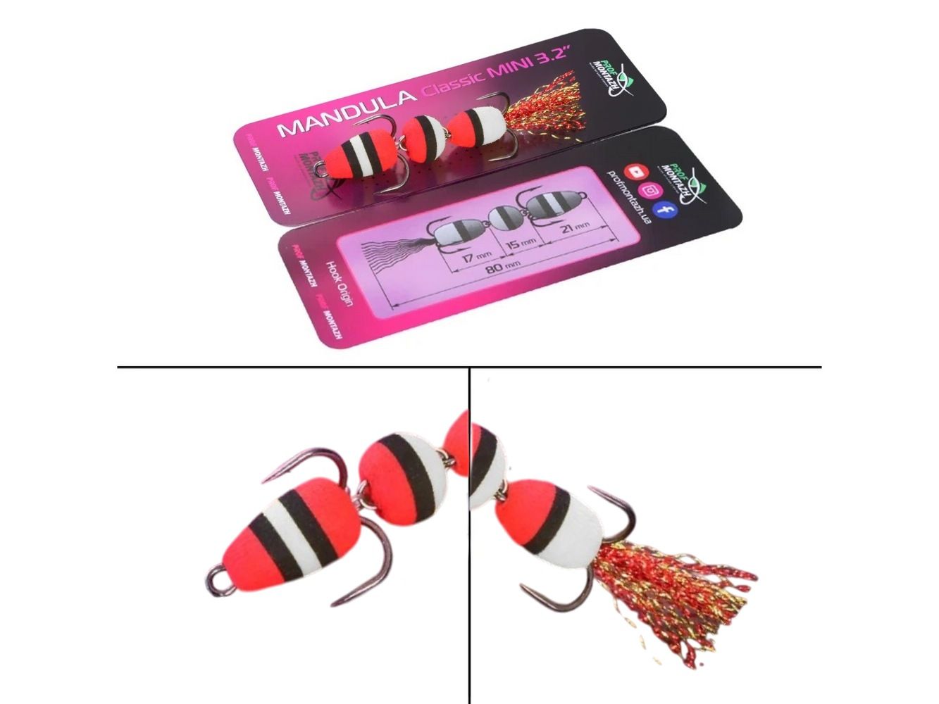 Mandula Classic Mini 3,2" (80 мм) - виготовлена з 3 сегментів кулястої форми. Кожен сегмент між собою скріплюється міцним нержавіючим дротом діаметром 0,8 мм. Вся серія Classic відрізняється надійністю і міццю. Оснащується двома гострими трійниками номер 2 і 4. Опушка на хвості з якісного люрексу, який на етапі виготовлення мандули додатково розпушується вручну.
