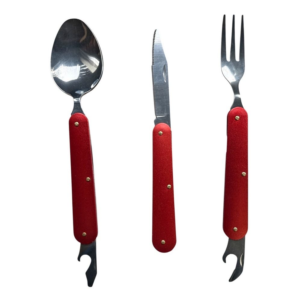 Прибори в наборі складні. Виделка обладнана консервним ножем, а на ложці є відкривачка зі шліцевою викруткою.