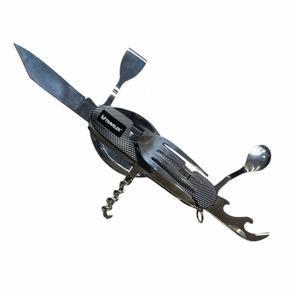 Містить 9 інструментів: ніж, вилку, ложку, чайну ложку, штопор, шило, гачок, відкривачку-консервний ніж, лопатку для смаження. Прибори в мультитулі складні. Розмір у складеному вигляді – 108 мм.