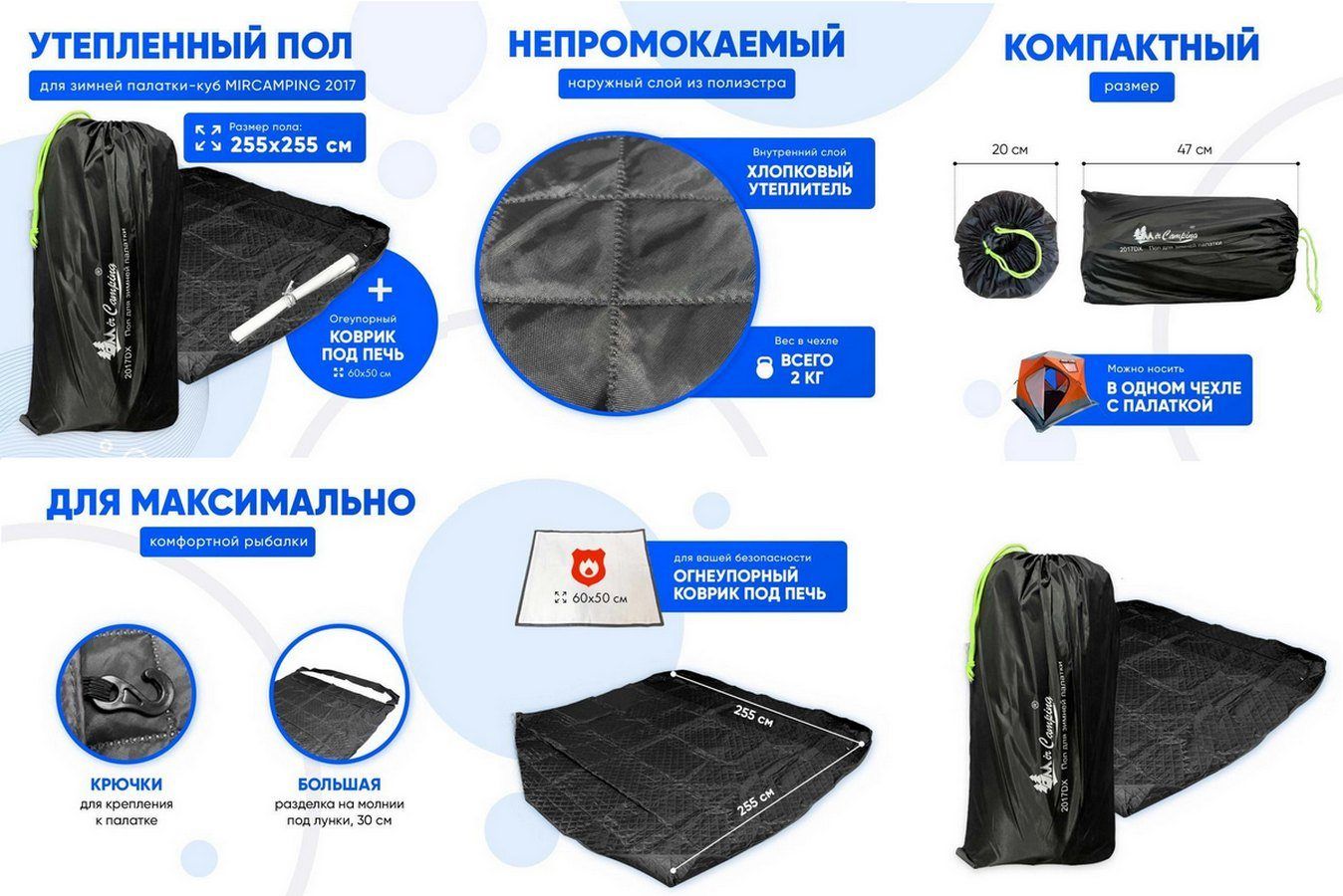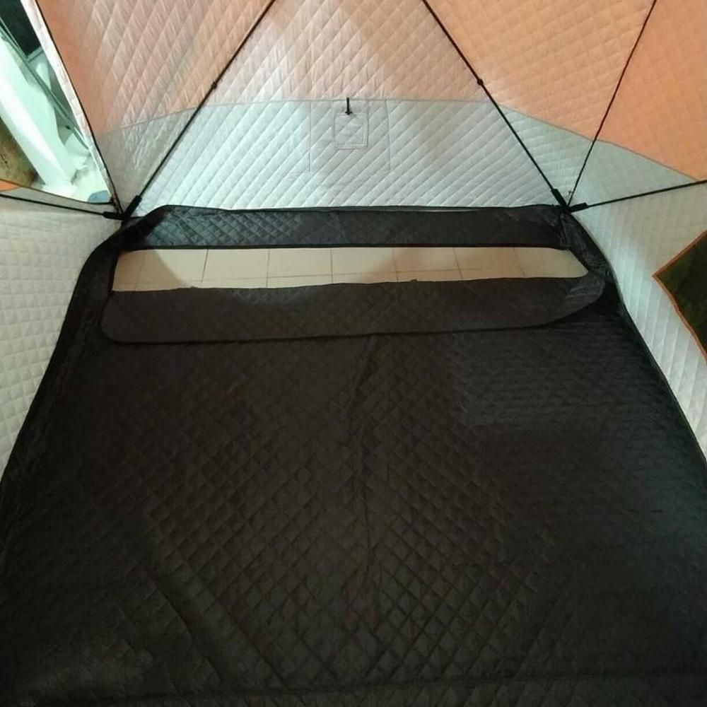 Підлога для зимового намету Mircamping 2017А забезпечує комфортні умови для відпочинку. Виготовлений з непромокаючого поліестеру з утепленим прошарком. Підлога тепла та вологостійка зі спеціальним утепленим прошарком, з герметичними отворами під лунки, для зимового підлідного лову. Також у комплекті йде вогнетривкий килимок 60х60 см під грубку. Підлога має гачки по кутах для кріплення до намету. По довжині намету є виріз шириною 30 см на блискавці для лунок.