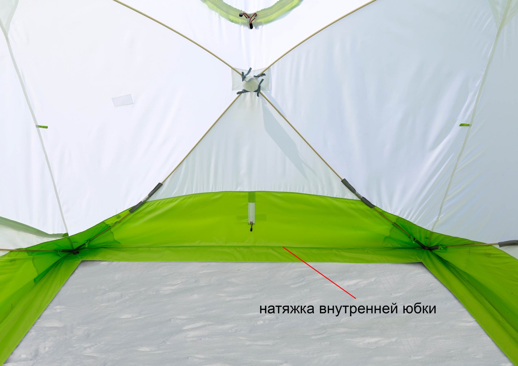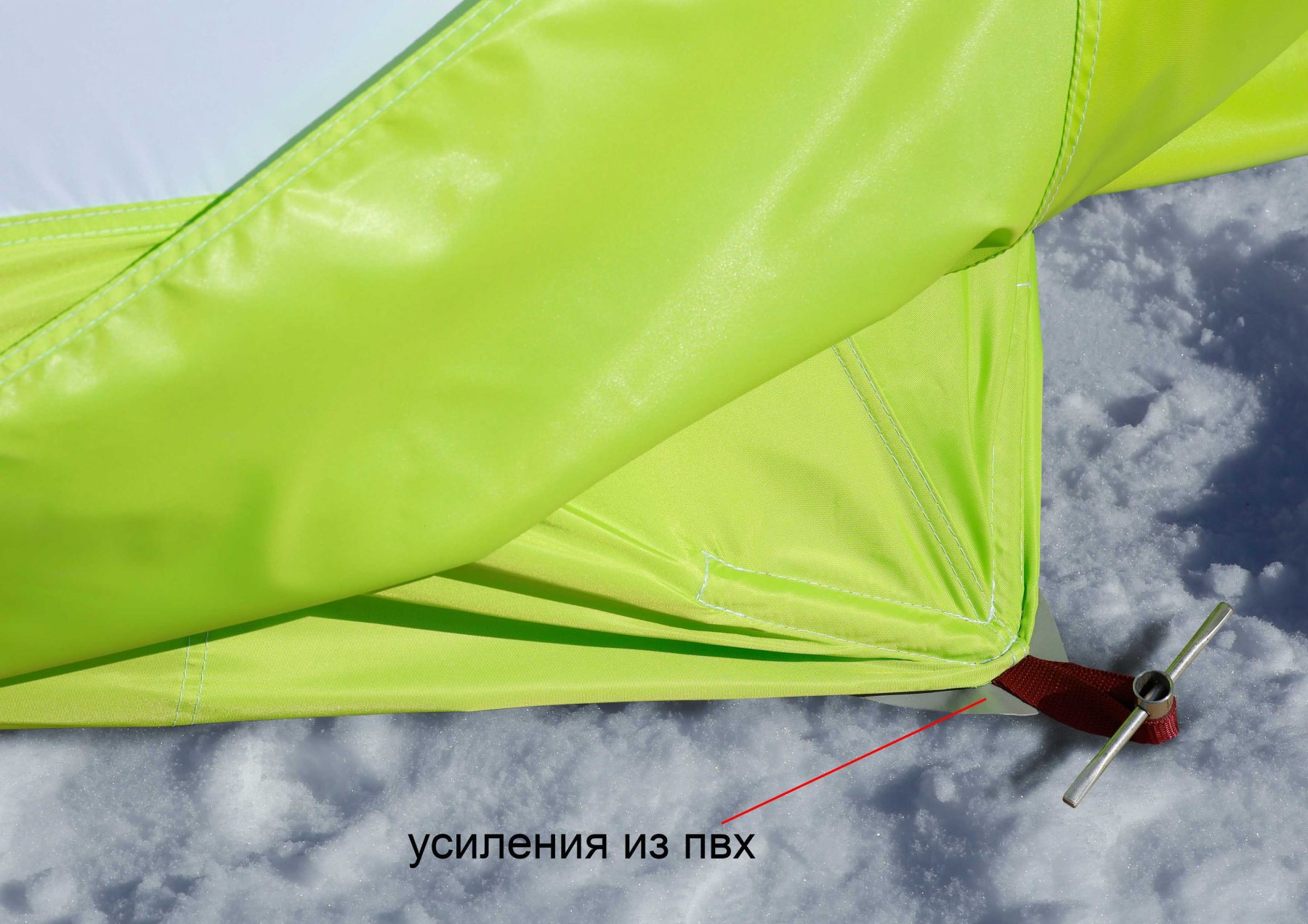 При експлуатації намету без гідроізоляційного дна, кріплення палатки до льоду (грунту) рекомендується проводити за посилені петлі, розташовані по кутах намету під зовнішньої спідницею.