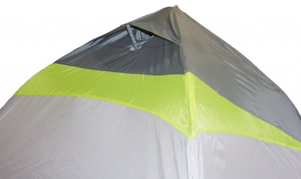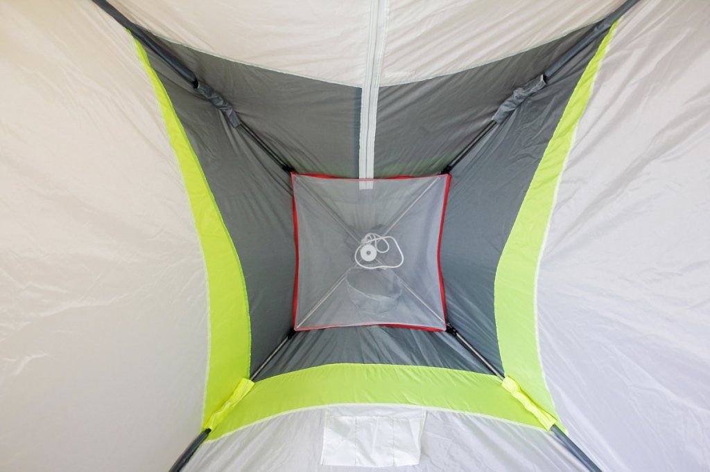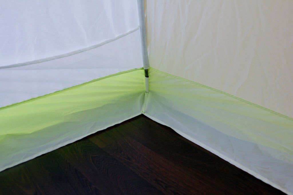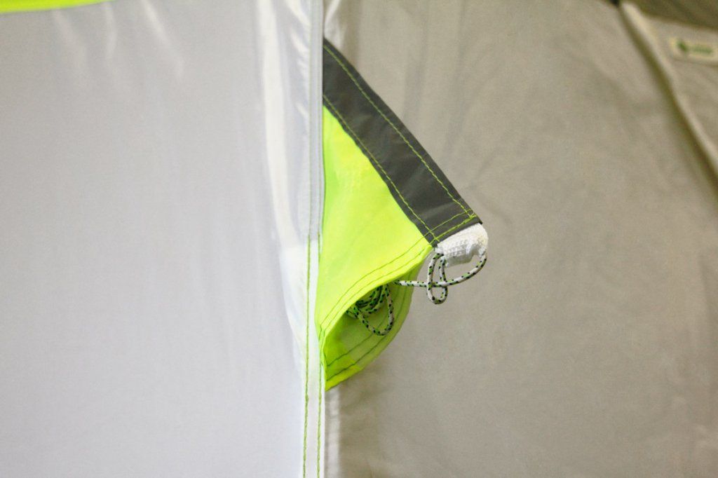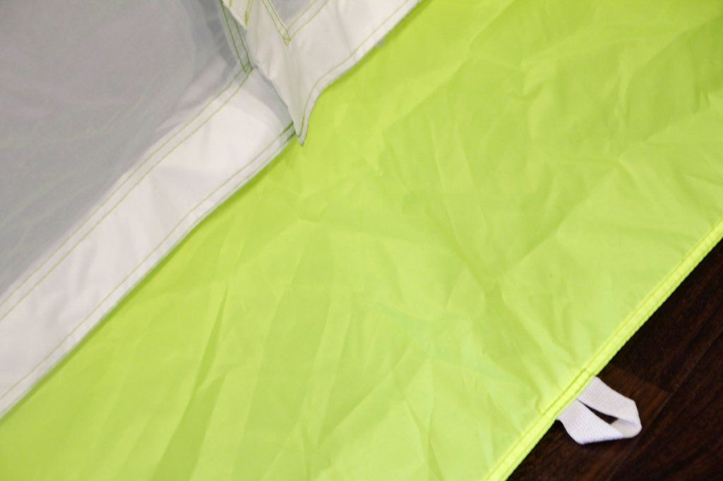 Забарвлення намету виконано в яскраво-салатовий колір і навіть в найпохмуріший день в ньому буде завжди світло і затишно. Для безпеки в нічний час на кріпленнях для розтяжок передбачені світловідбиваючі елементи.