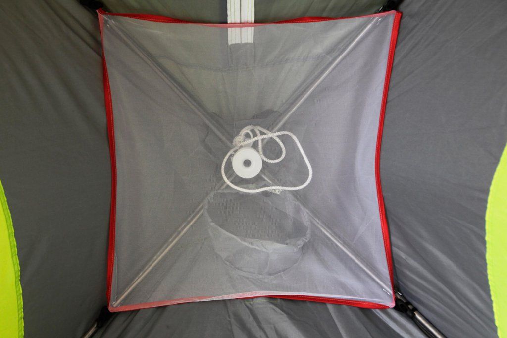 Зсередини намет забезпечений кишенями для речей і вудильників, а також навісною полицею під стелею.
