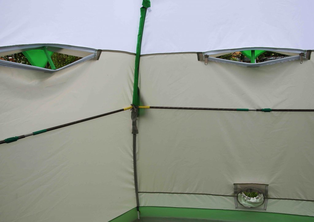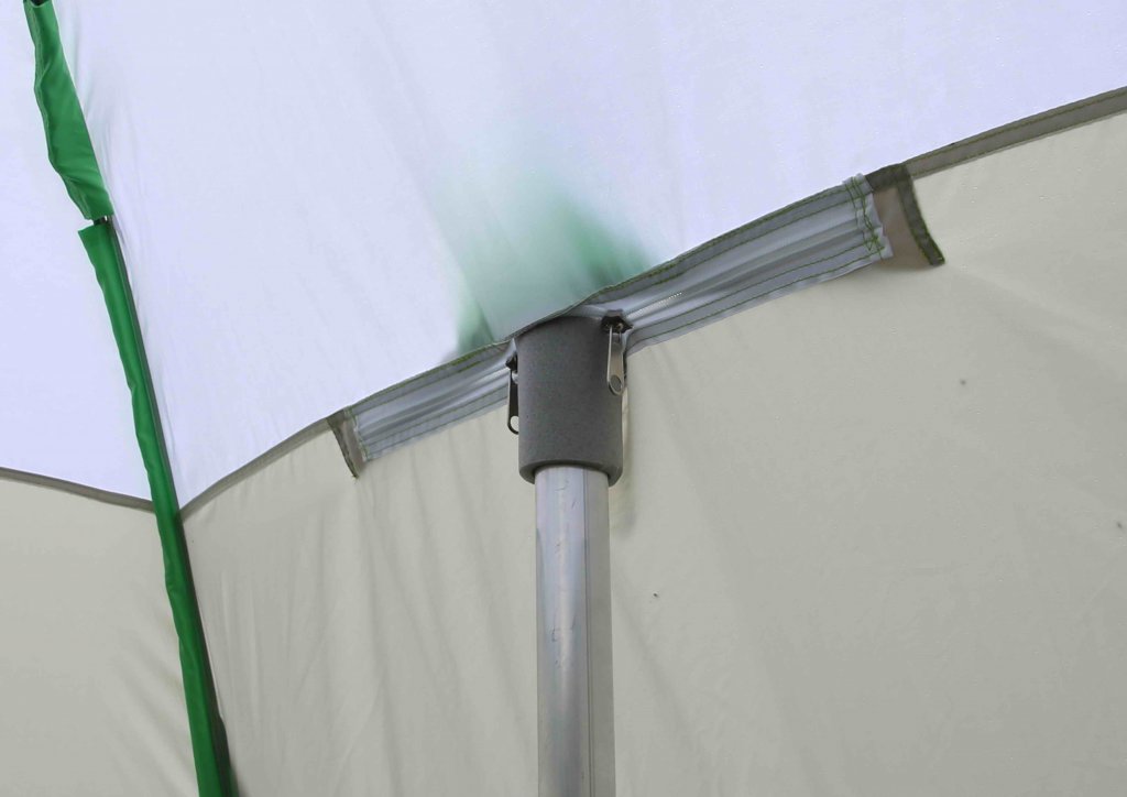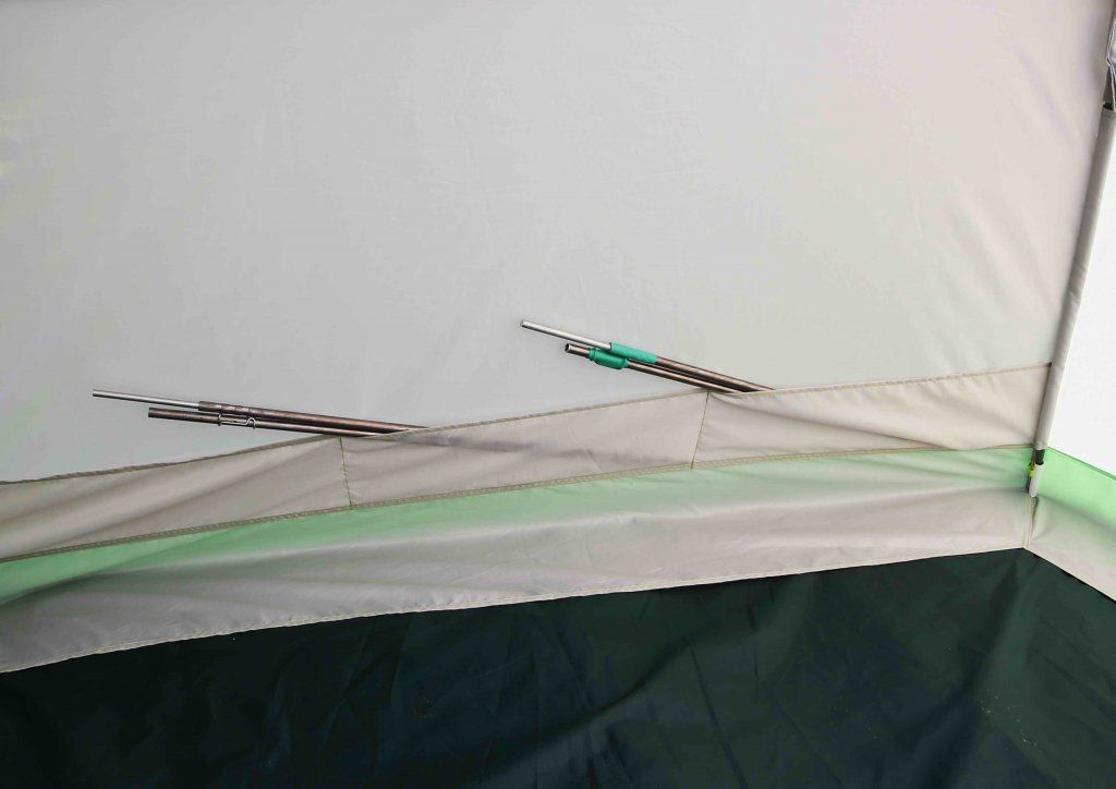 Намет оснащений дев'ятьма посиленими кріпленнями для розтяжок: 5 кріплень на дугах і 4 на стінках намету. Додатково на кожній дузі є по три міцних кріплення: одне у верхній частині і два в нижній (одне над спідницею і одне під спідницею).