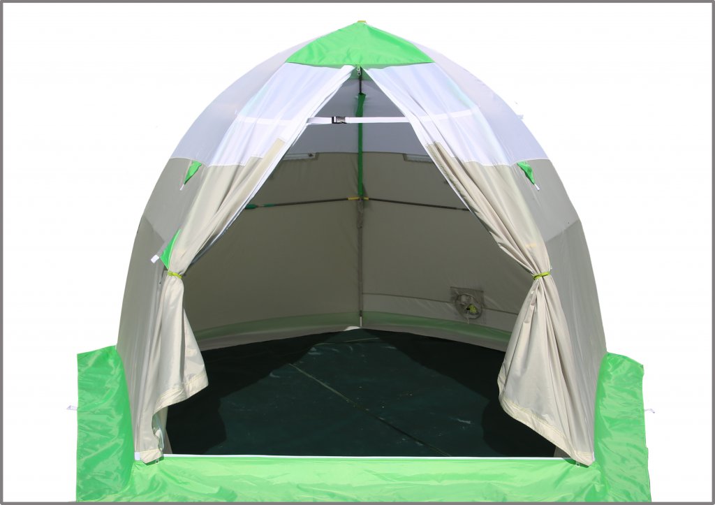 Широкі двостулкові Т-подібні двері намету оснащені трьома замками, що дозволяють відкривати кожну стулку окремо, а також розкривати двері на всю стінку намету, утворюючи прохід шириною 1,5 метра. Широкий вхід дозволяє заносити всередину великогабаритні речі та є безперечною перевагою наметів зонтичного типу. Блискавки дверного замка із зовнішнього боку оснащені жорсткою і широкою захисною планкою, яка забезпечує їх надійний захист від продування вітром і обмороження.