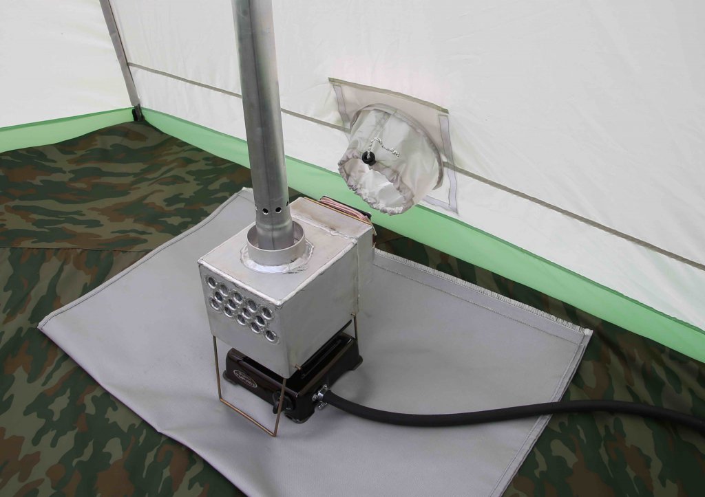 При використанні газового обігрівача з теплообмінником витяжна труба встановлюється в віконце, яке забезпечено подвійним замком на блискавці, що дозволяє фіксувати трубу теплообмінника.