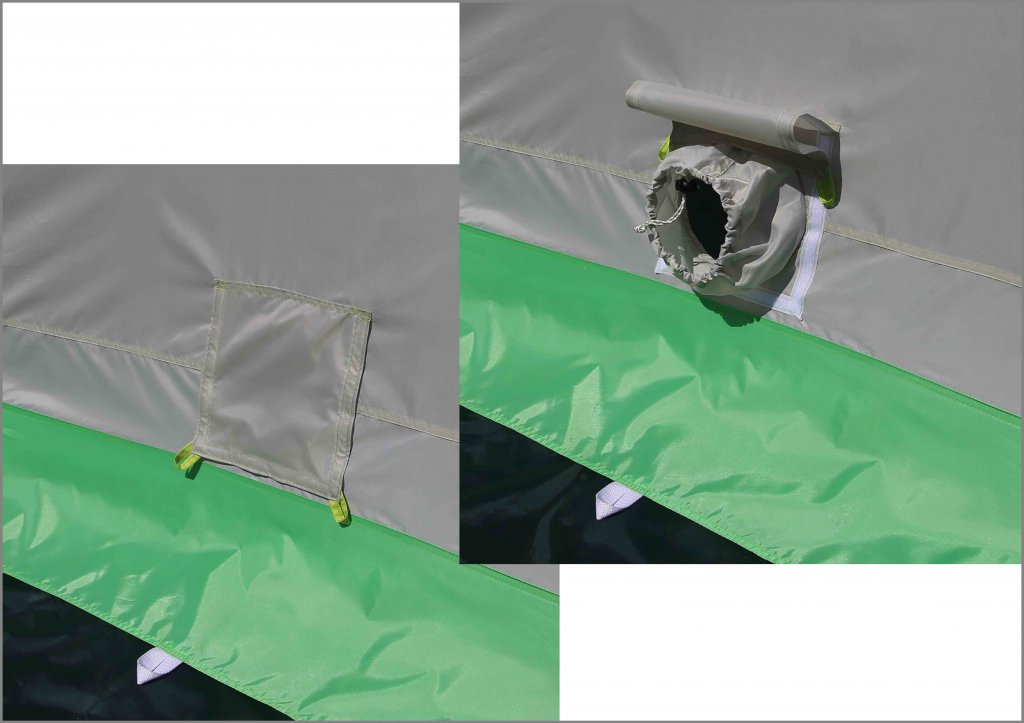 У нижній частині намету розташований клапан для підсосу повітря. Із зовнішнього боку клапан захищений від попадання опадів козирком, що відкривається. Клапан регулюється високоякісної системою утяжки, що дозволяє щільно обіймати встановлену в нього приточну трубу або проводити повне закриття, гарантуючи захист намету від продування.