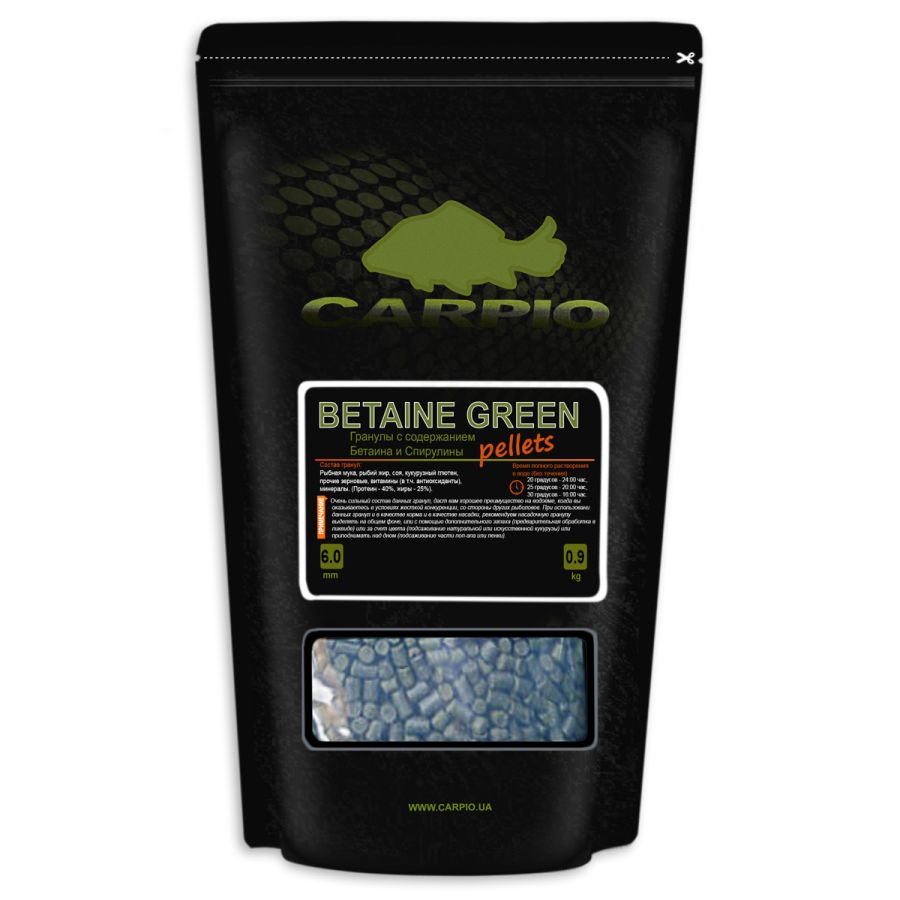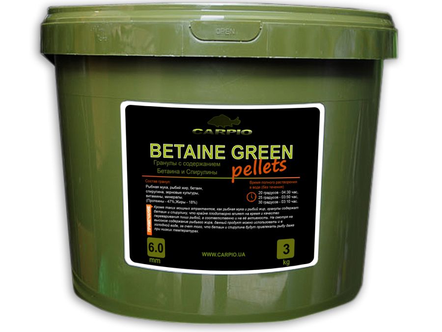 Гранули BETAINE GREEN містять 47% протеїну та 18% жиру. Виготовлені з високоякісного (Чилі, Перу) рибного борошна, риб'ячого жиру, суміші зернових культур. Містять вітаміни, мінерали, спіруліну, бетаїн. Крім таких потужних атрактантів, як рибне борошно та риб'ячий жир, гранули додатково залучають коропа бетаїном та спіруліною, які і собі вкрай плідно впливають на час та якість перетравлення їжі рибою, а відповідно і на її активність.
