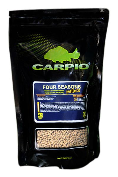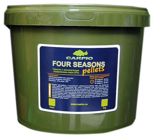 Гранули FOUR SEASONS містять 33% протеїну і всього 6% жиру. Виготовлені з високоякісного рибного борошна (виробництва Перу, Чилі), риб'ячого жиру, зернових культур. Містять вітаміни і мінерали. Важливою особливістю даних гранул є те, що вони містять мінімум жиру. Це робить їх дуже хорошим інструментом при лові в холодній воді (весна / осінь), коли метаболізм риби вповільнюється. Час розчинення таких гранул мінімальний, що сприяє максимально швидкій передачі у воду харчового сигналу. Крім того, гранули мають пористу структуру, що сприяє дуже швидкому проникненню ваших рідких атрактантів всередину гранули і такій же швидкій передачі цих привабливих рідин у вашій точці лову.