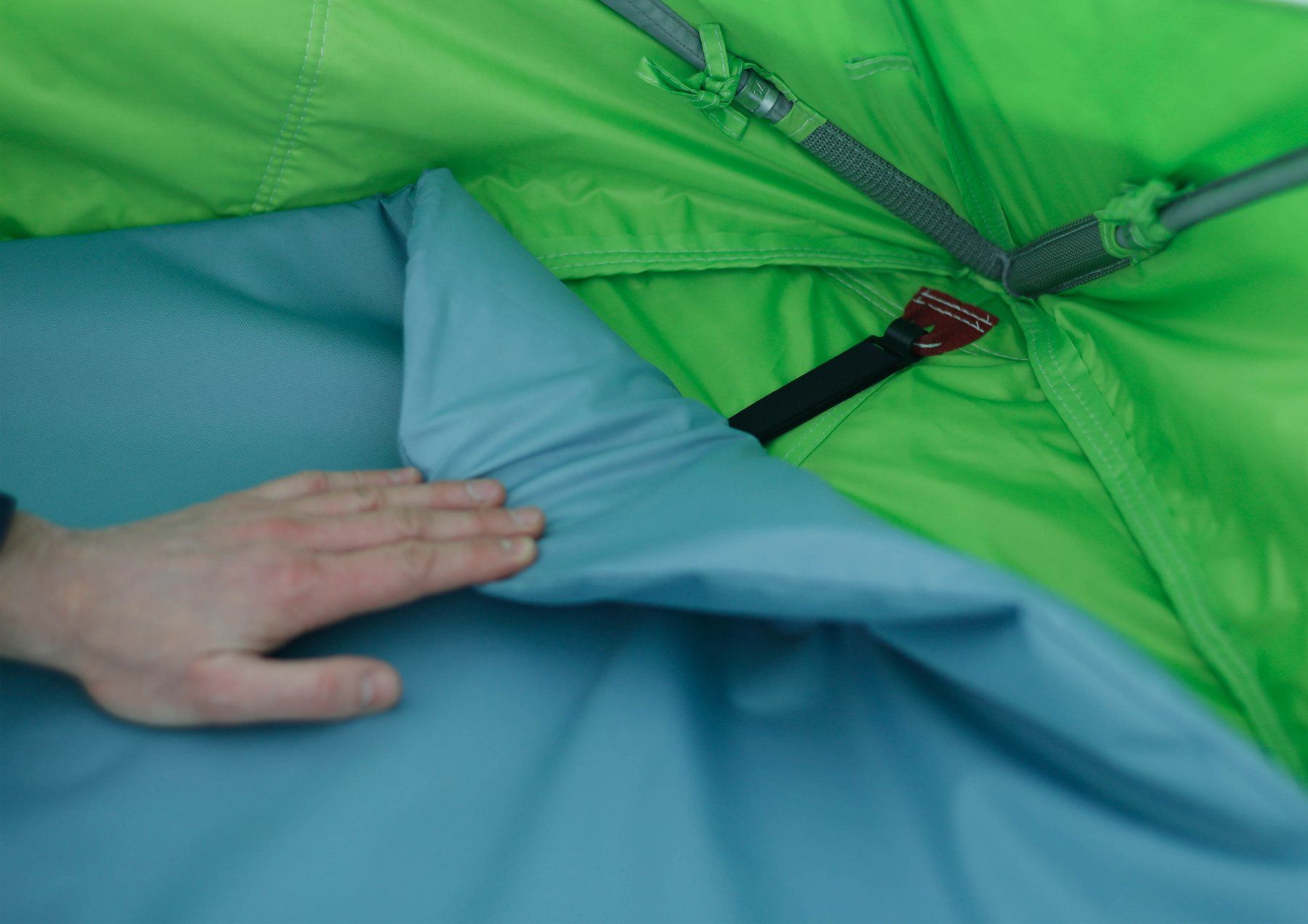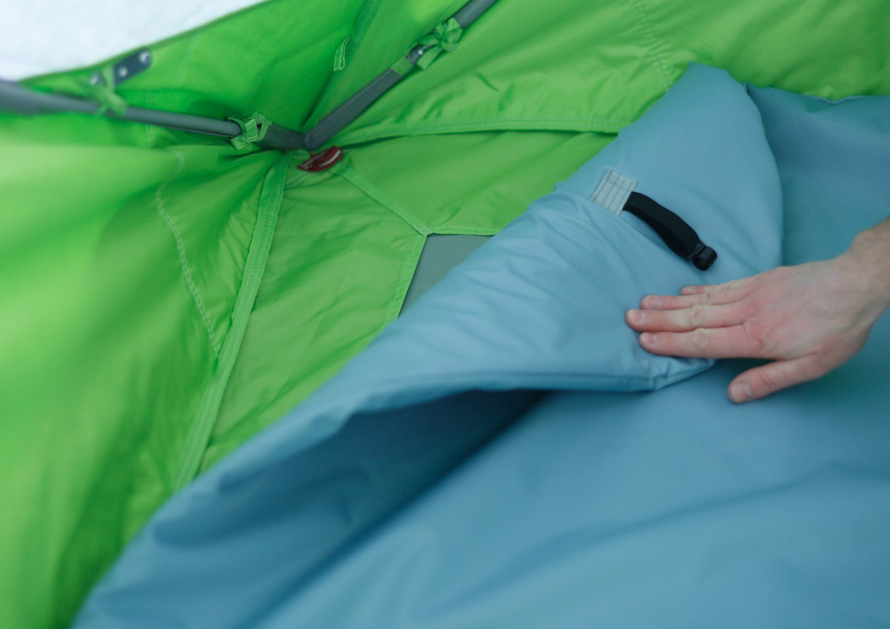 Утеплена підлога кріпиться зсередини на гачках до спеціальних петель, розташованих по кутах на внутрішній спідниці намету. Утеплена підлога накриває внутрішню спідницю намету, запобігаючи задування вітру знизу.