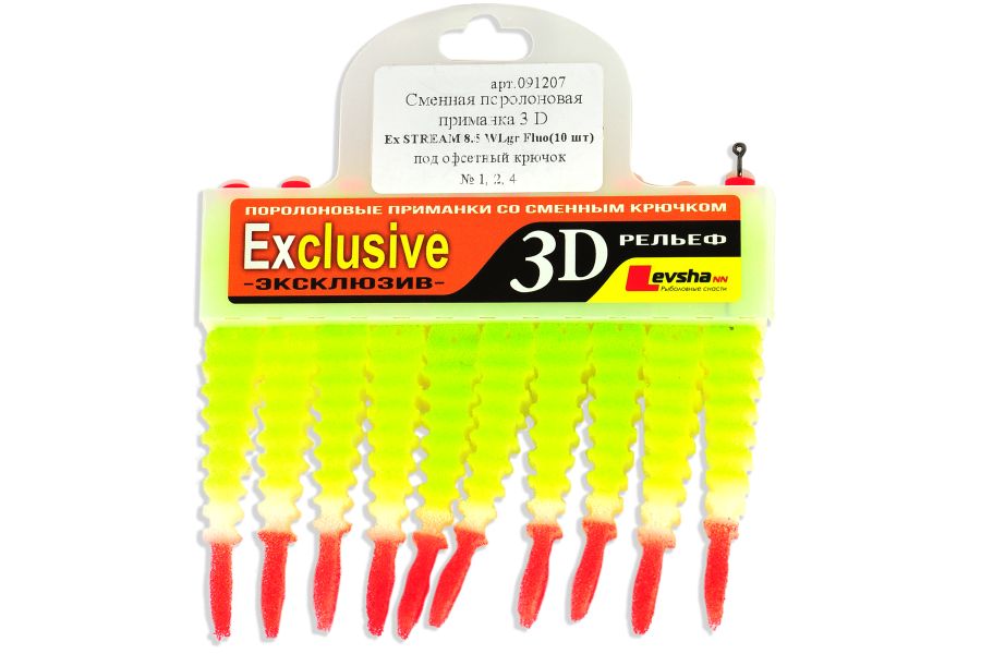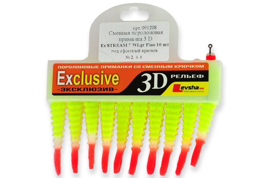 Поролонові рибки 3D Ex Stream імітують молодь більшості риб. Форма рибок 3D Ex Stream була розроблена спеціально для лову протягом. У цій серії був вперше використаний хвилеподібний рельєф поверхні рибки і це нововведення принесло дивовижні результати. Хвилястий рельєф багаторазово підвищує привабливість поролонової рибки для хижака і робить рухи приманки більш реалістичними.