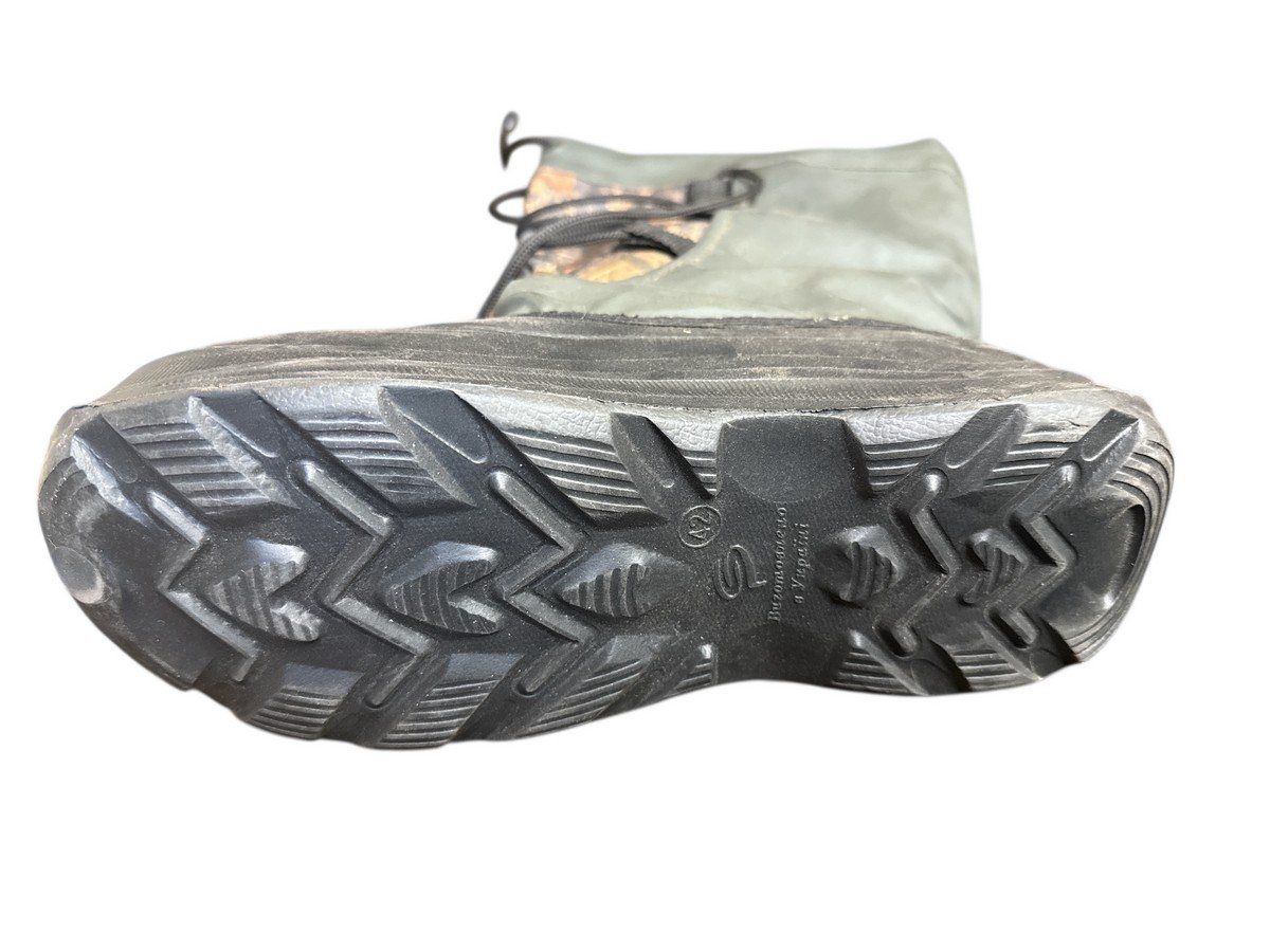 Верх чобіт виготовлений зі щільного зносостійкого ПВХ матеріалу з камуфляжною вставкою, що підвищує практичність та маскування на природі. Манжета оснащена шнурівкою з фіксаторами, що дозволяє щільно затягнути халяву та захистити ногу від попадання снігу, води та холодного повітря.