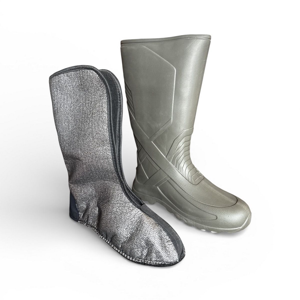 Комплектуються фольгованим вкладишем (шкарпетка). Вкладиш зроблений з багатошарового сендвіча, який працює на захист від холоду, збереження тепла тіла, виведення вологи і зручність руху. З його допомогою можна перетворити звичайні гумові чоботи на утеплене зимове взуття.