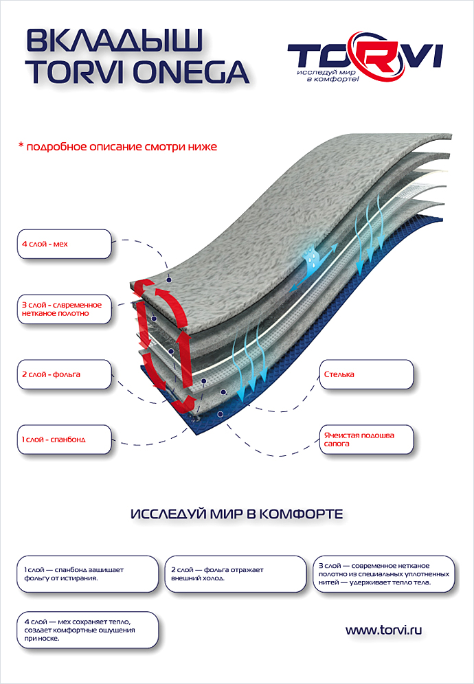 Завдяки новітнім технологіям та сучасним матеріалам Torvi Onega зберігають більшу кількість тепла, ніж звичайні чоботи, при цьому захищають ноги від промокання. Це взуття ідеальне для будь-якого часу, при цьому воно буде доречне як в місті, так і на природі. Нетривіальний дизайн підходить активним людям обох статей.