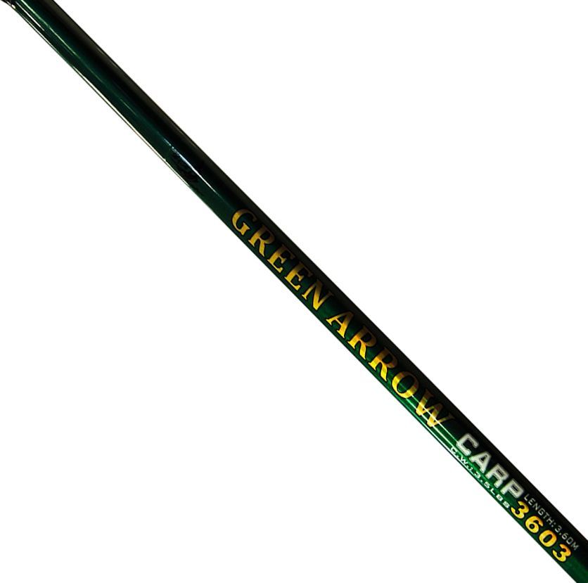 Green Arrow довжиною 3.6 м тест 3.5lbs - трискладове коропове вудлище для любительскої риболовлі. Оптимальна вага вантажу для лову цією вудкою становить сто тридцять грамів, при силовому закиданні можна доставляти оснастку більш ніж на сто метрів. Має великий запас міцності, тому впорається з трофейними коропами та білими амурами, головне не заводити вудилище за вертикаль і не забувати про фрикційне гальмо.