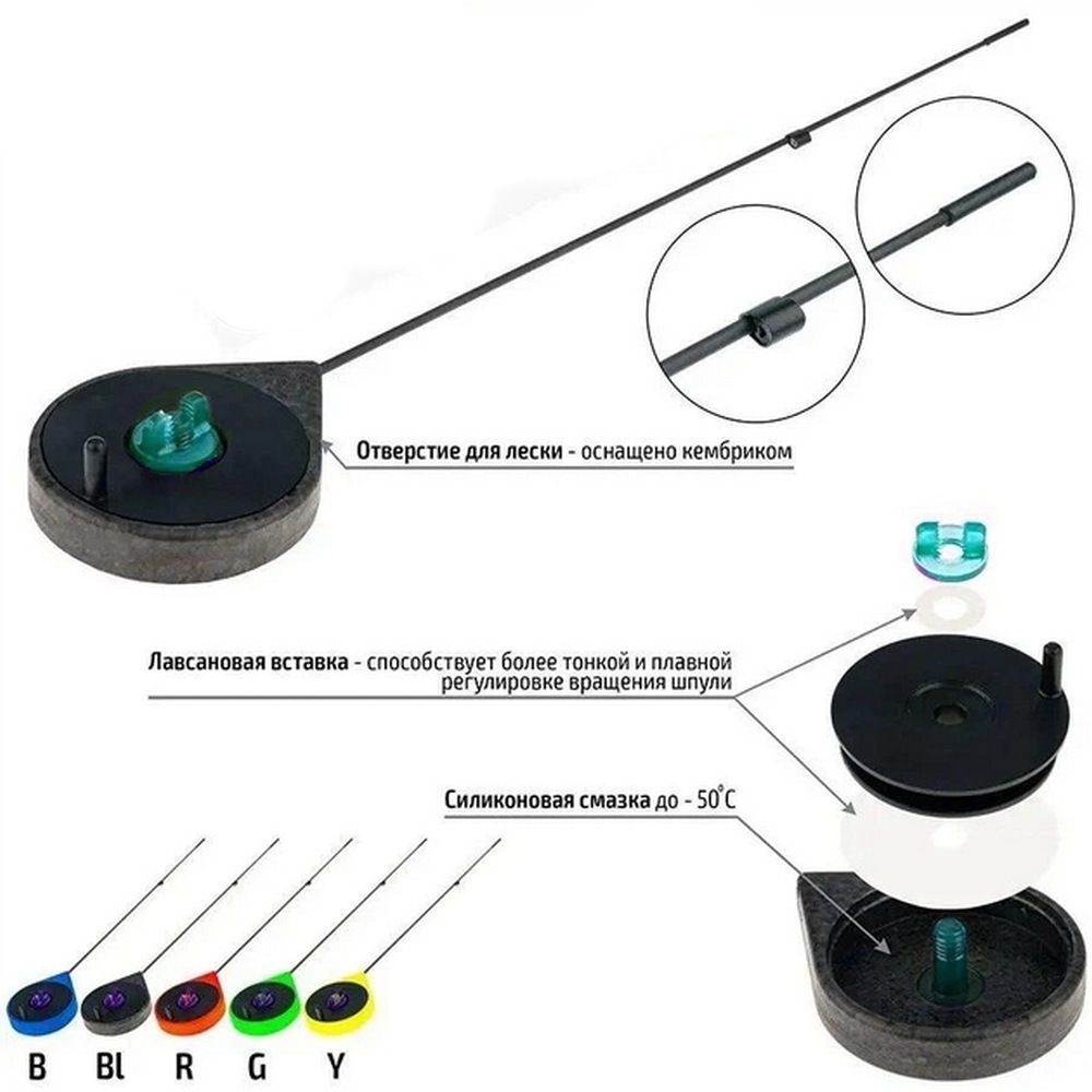 - Видимість: Випускається у яскравих кольорах (червоний, синій, зелений, фіолетовий, жовтий), що допомагає швидко знайти вудку на снігу.