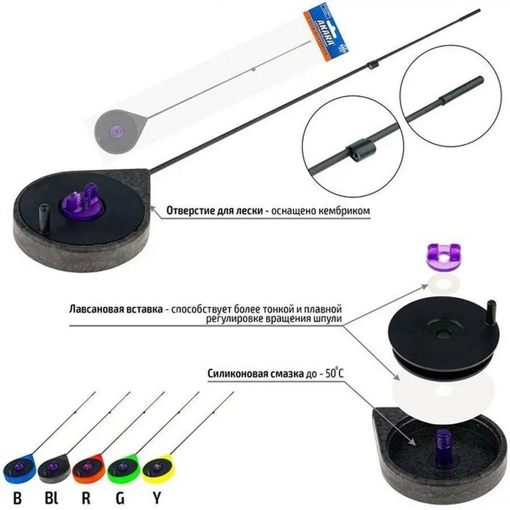 - Яскраві кольори корпусу (синій, червоний, зелений, жовтий) допомагають легко помітити вудку на снігу чи льоду