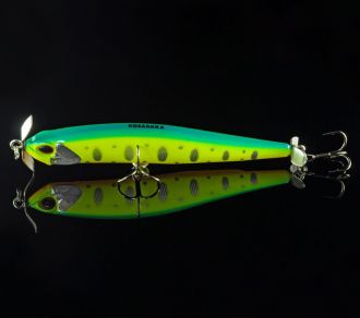 Вага становить 15 грамів, що досить багато для такої довжини приманки, тому далекий закид навіть не обговорюється - воблер летить за обрій. Цьому сприяє і його вузьке тіло, яке також здорово пробиває вітер, тому негода - не перешкода для цієї приманки.